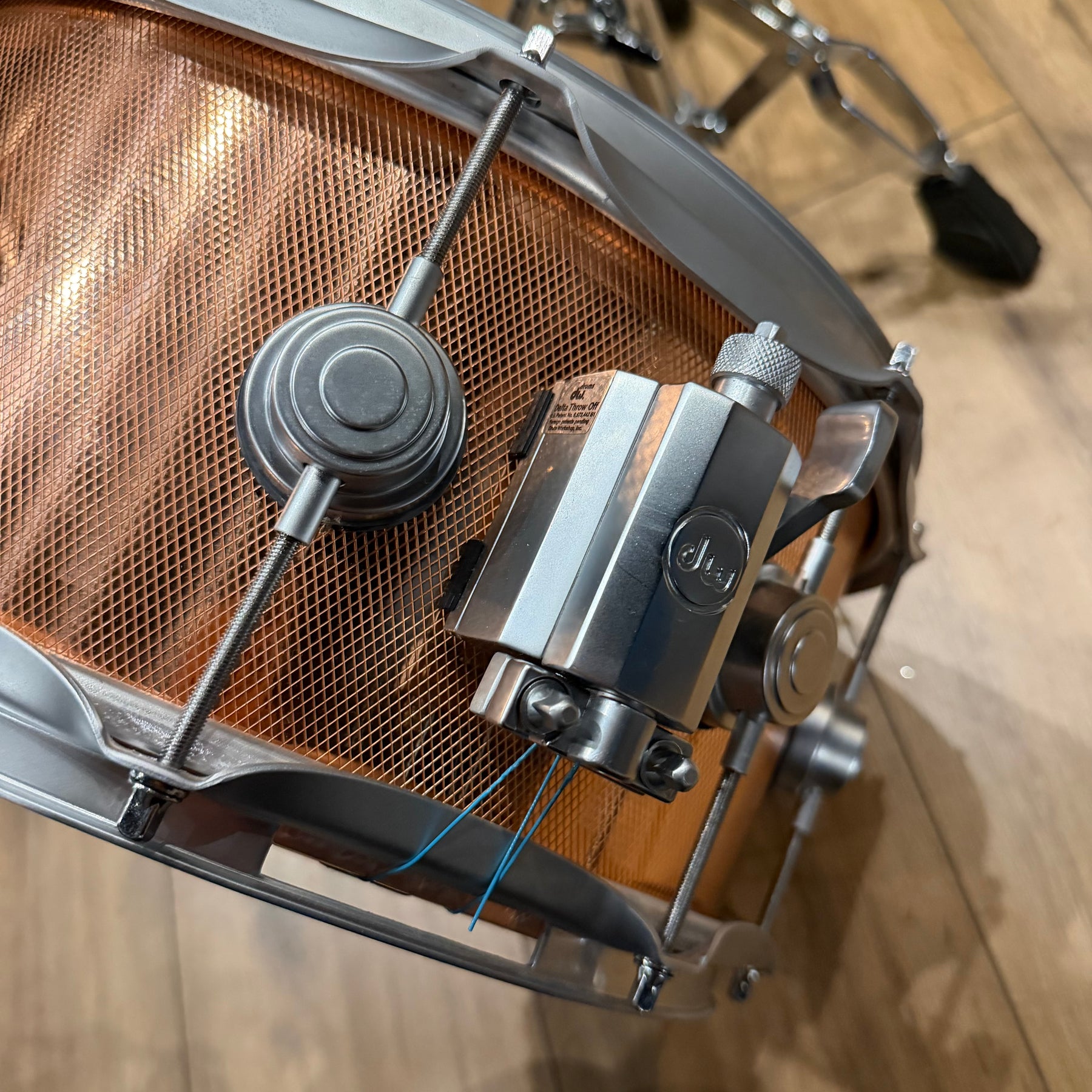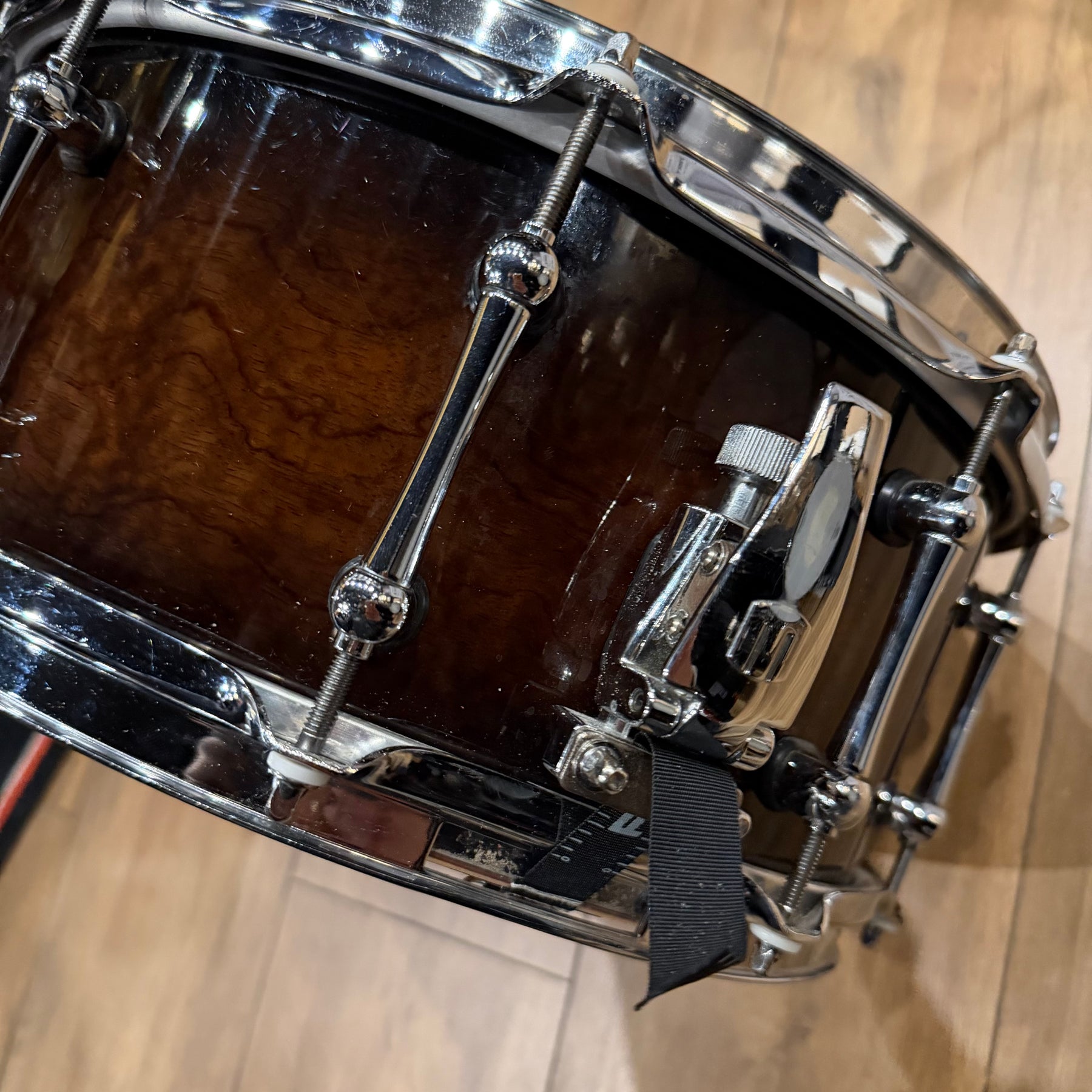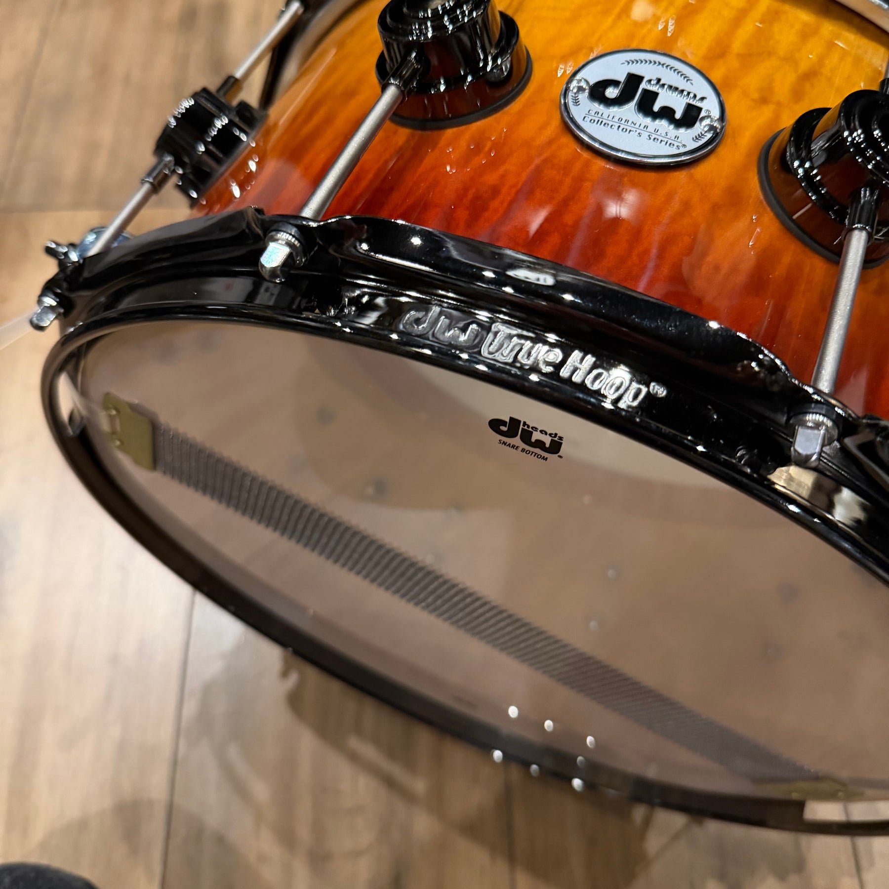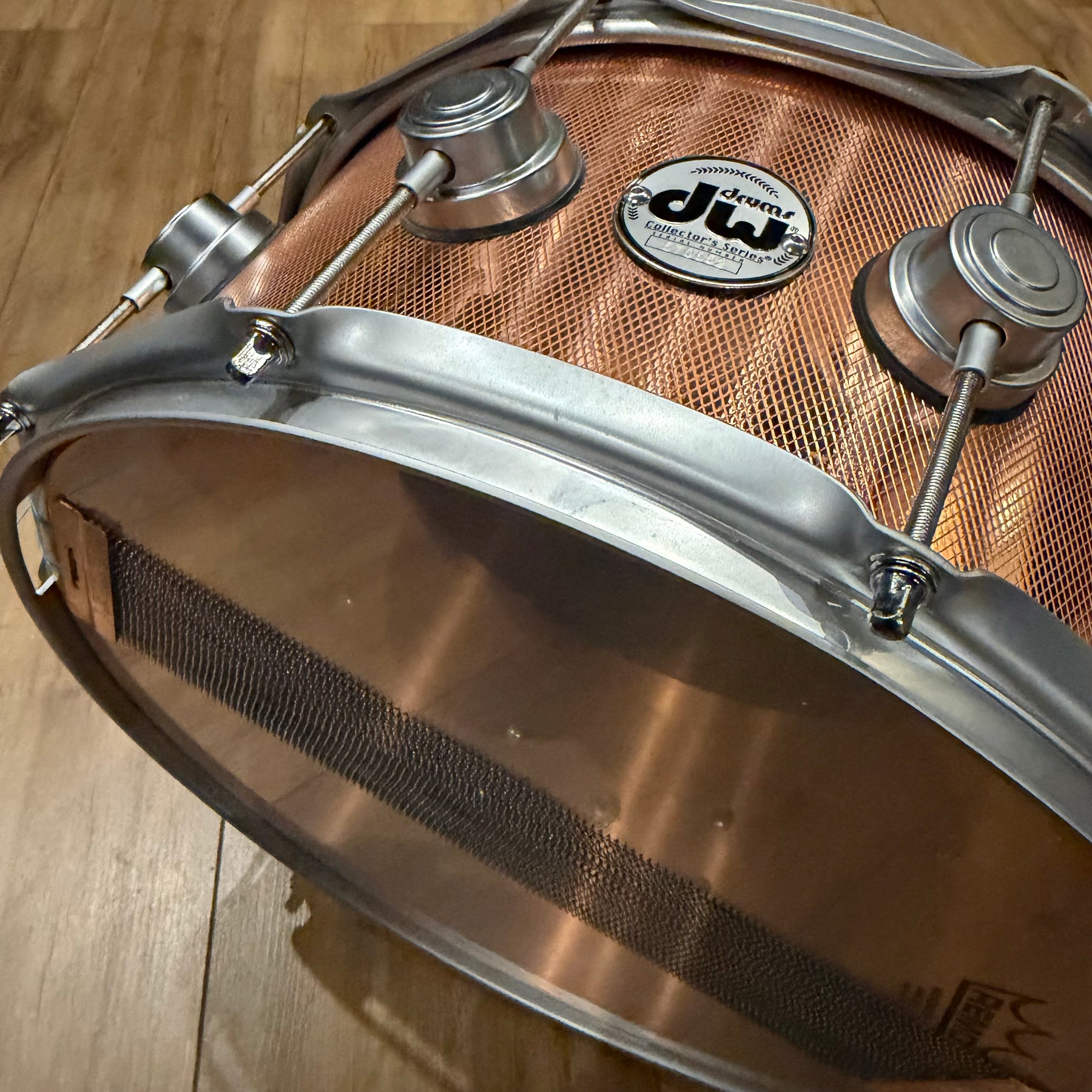 This special snare drum model combines warmth, volume and a throaty attack in a single instrument. The hybrid shell is an offshoot of DW's patented "Edge" design, and consists of a solid brass ring mounted on a 12-ply shell of mahogany and maple. This results in a sound with plenty of bite and ample low end.