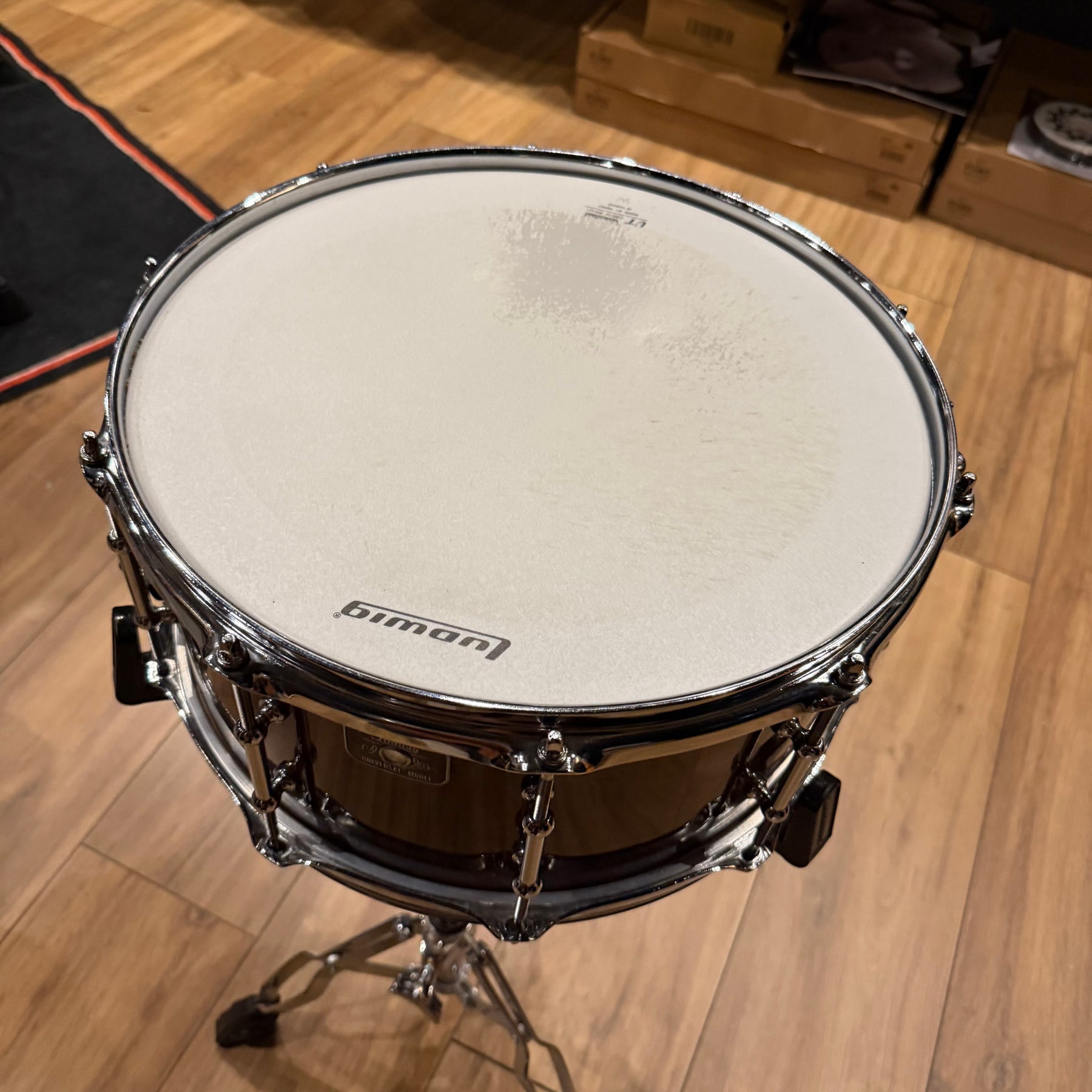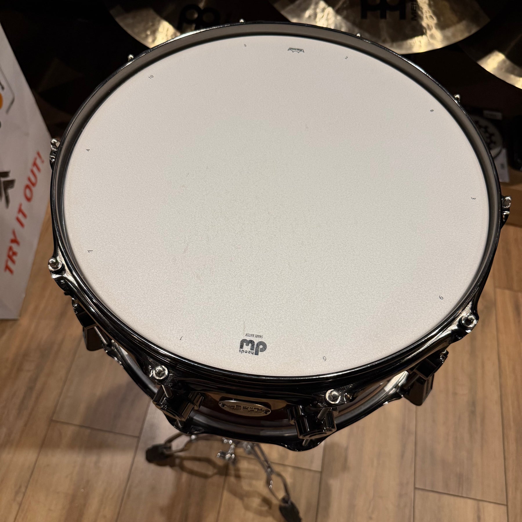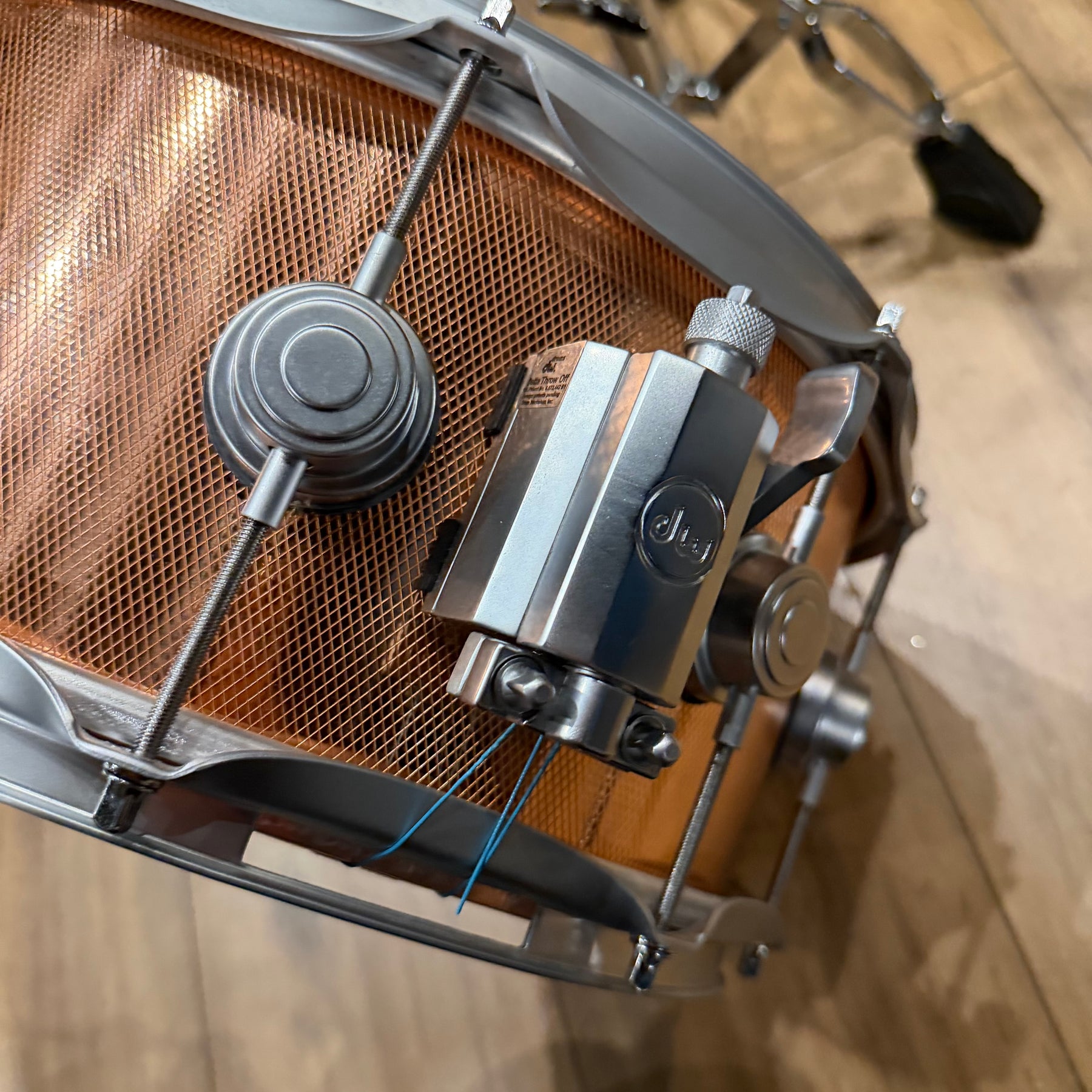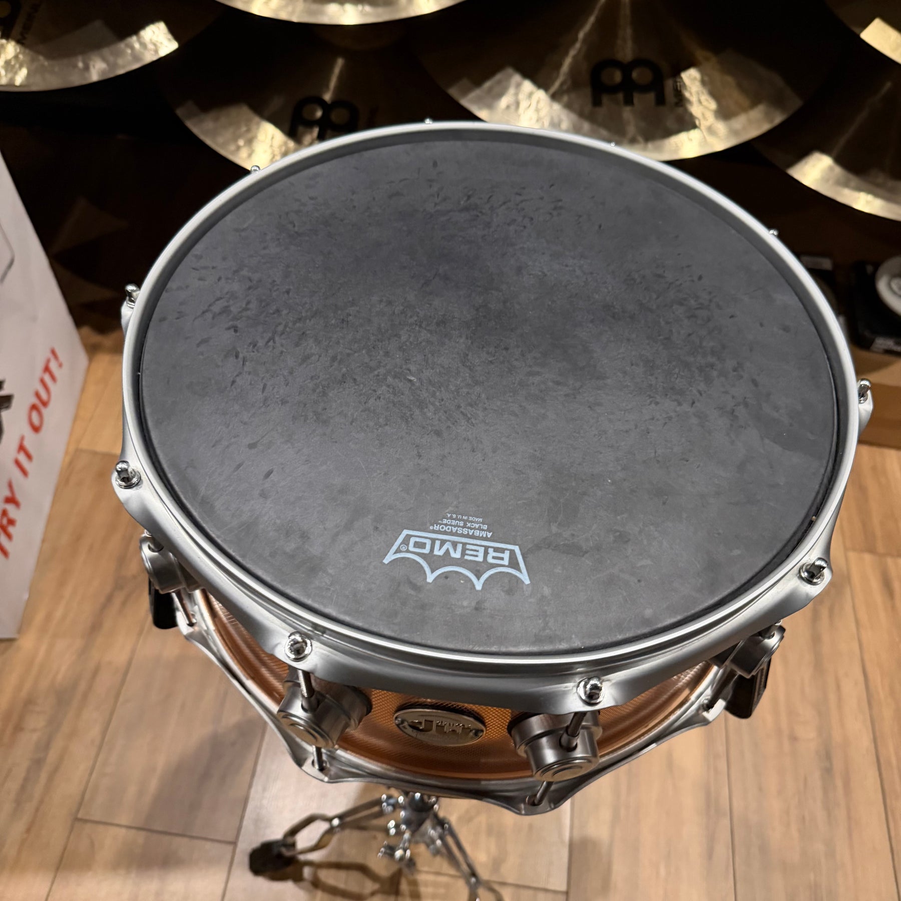 This special snare drum model combines warmth, volume and a throaty attack in a single instrument. The hybrid shell is an offshoot of DW's patented "Edge" design, and consists of a solid brass ring mounted on a 12-ply shell of mahogany and maple. This results in a sound with plenty of bite and ample low end.