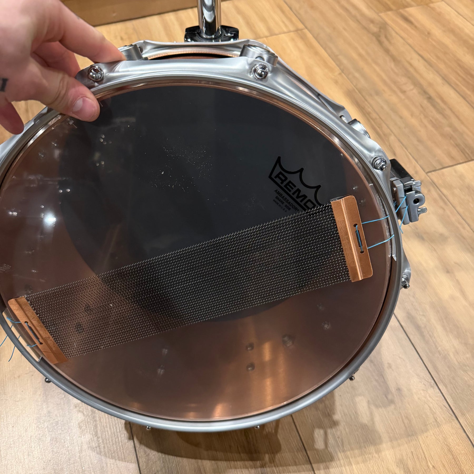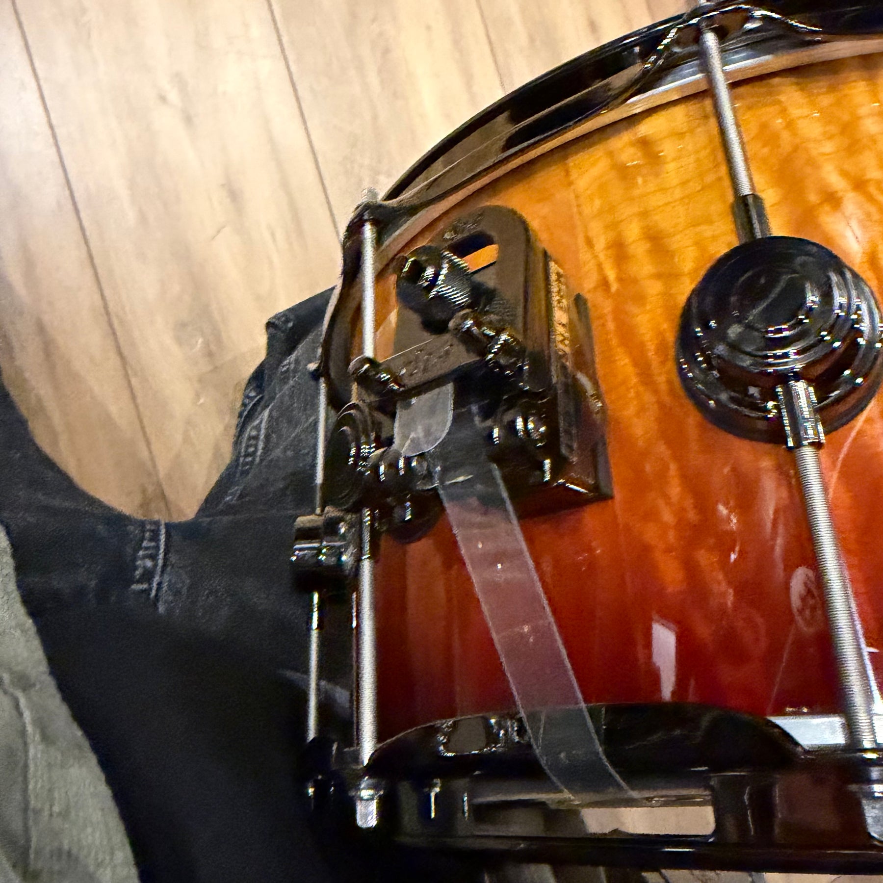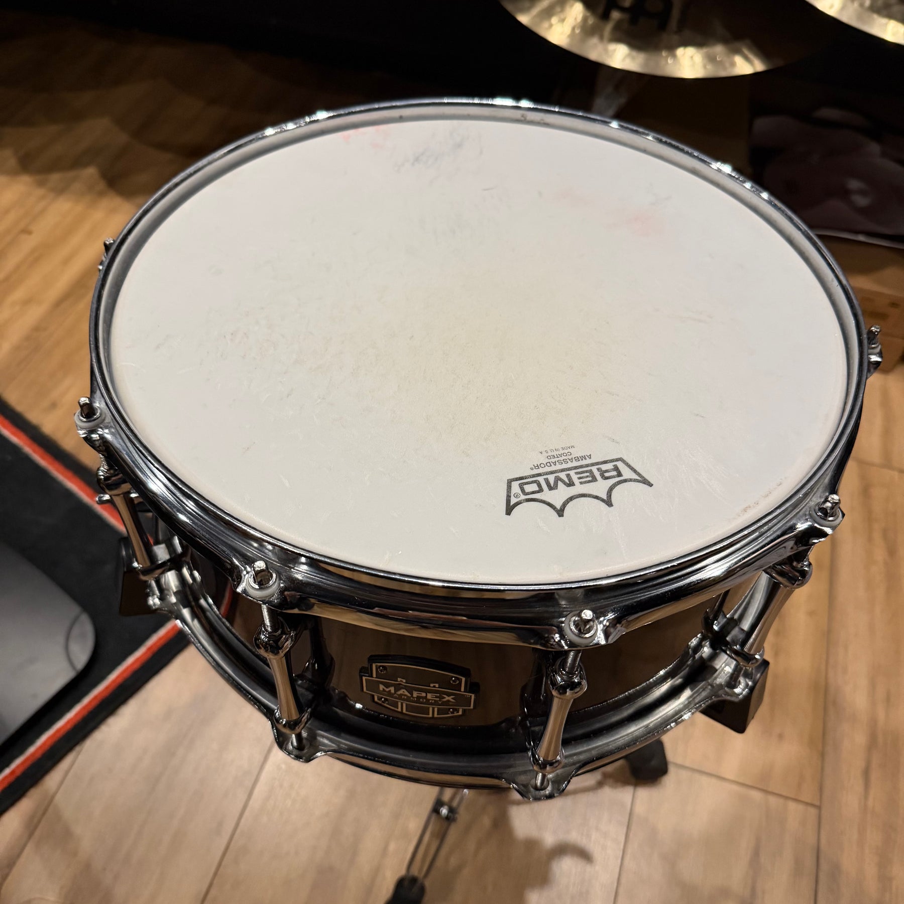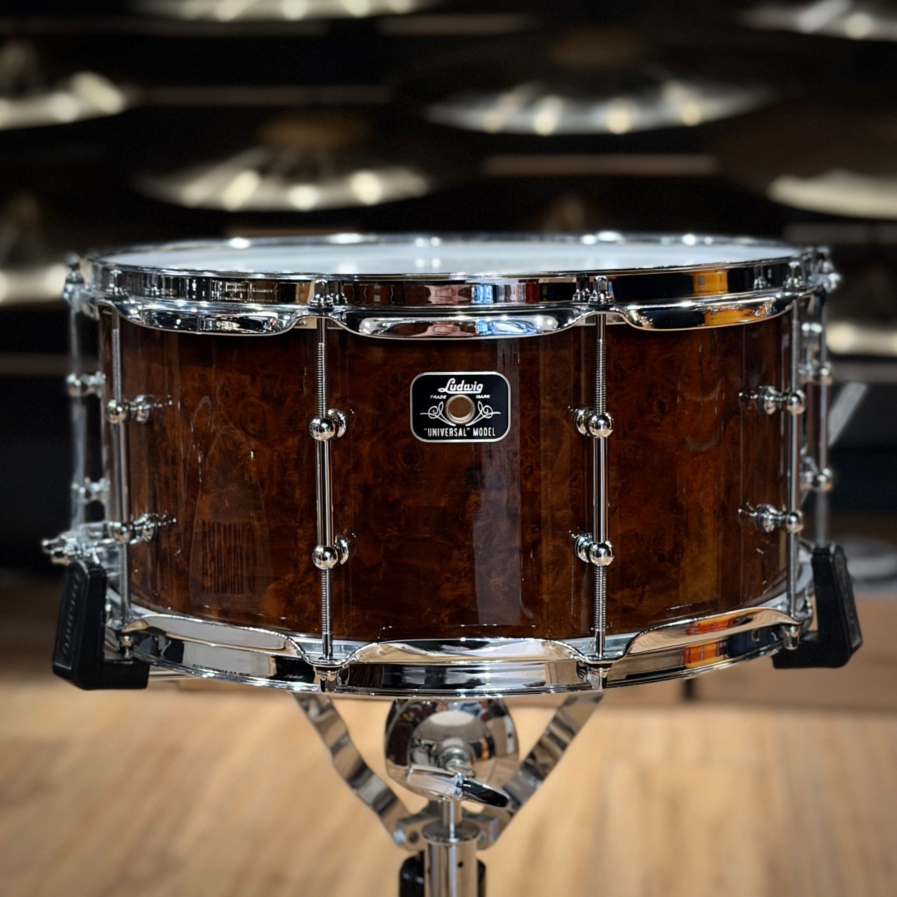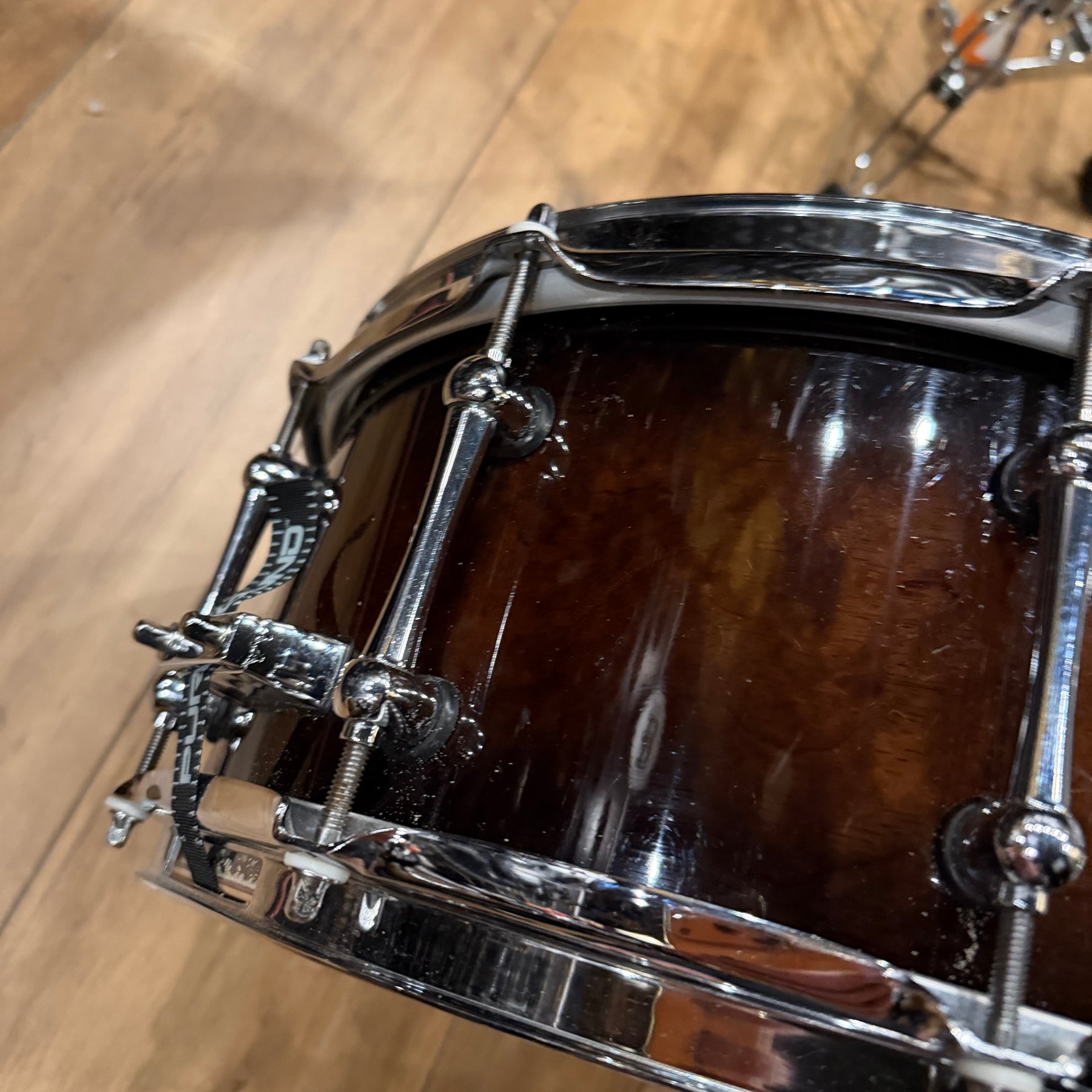 This special snare drum model combines warmth, volume and a throaty attack in a single instrument. The hybrid shell is an offshoot of DW's patented "Edge" design, and consists of a solid brass ring mounted on a 12-ply shell of mahogany and maple. This results in a sound with plenty of bite and ample low end.