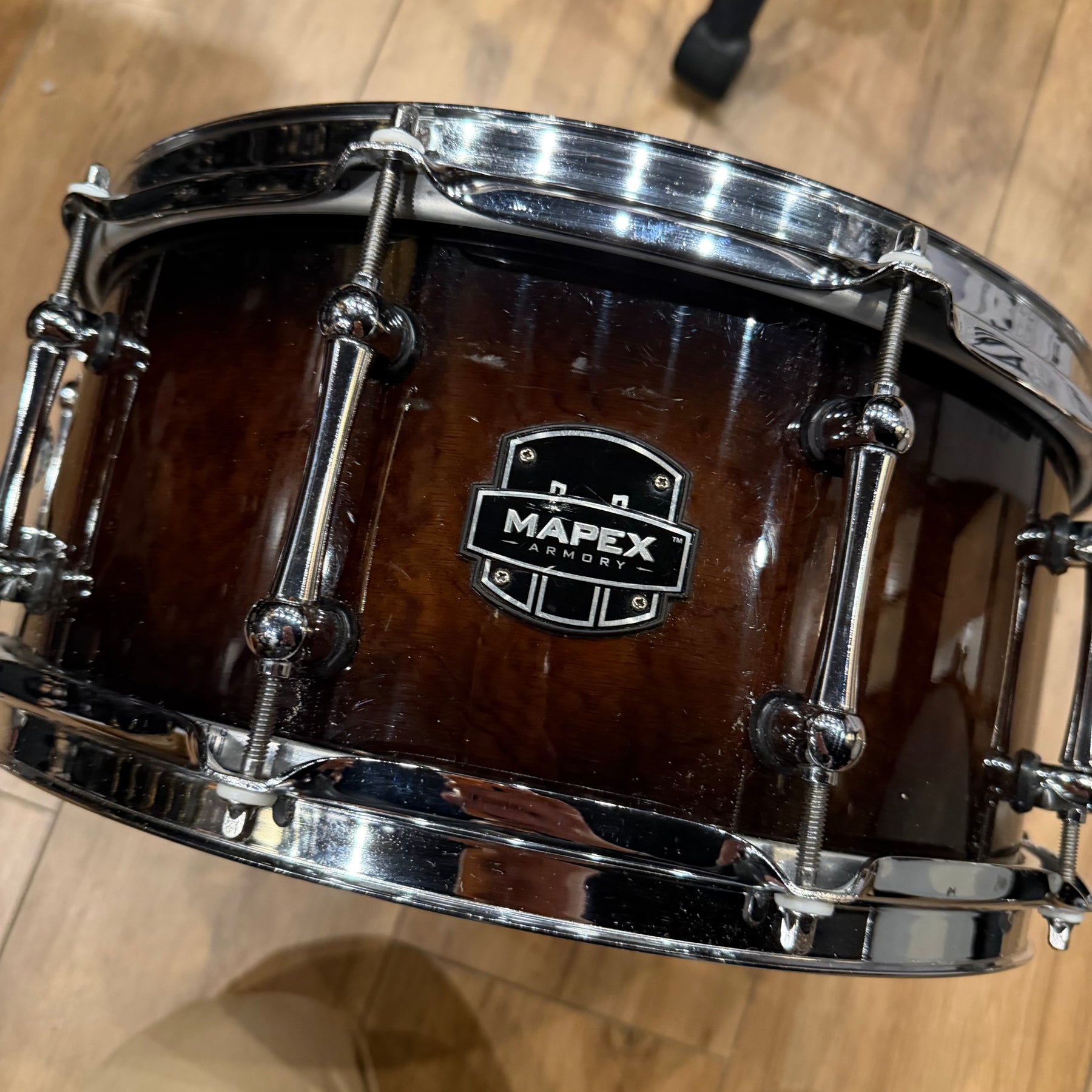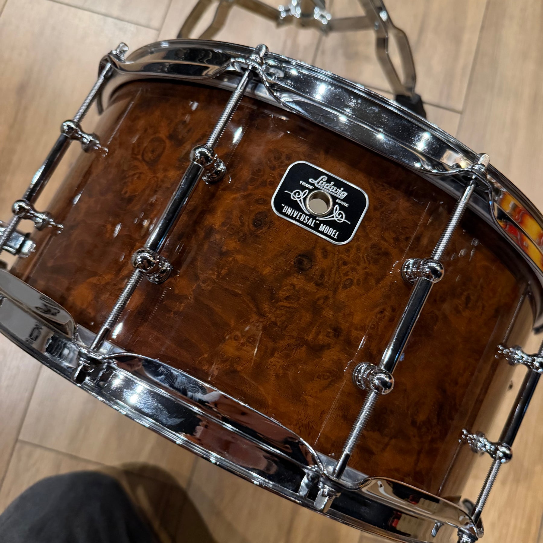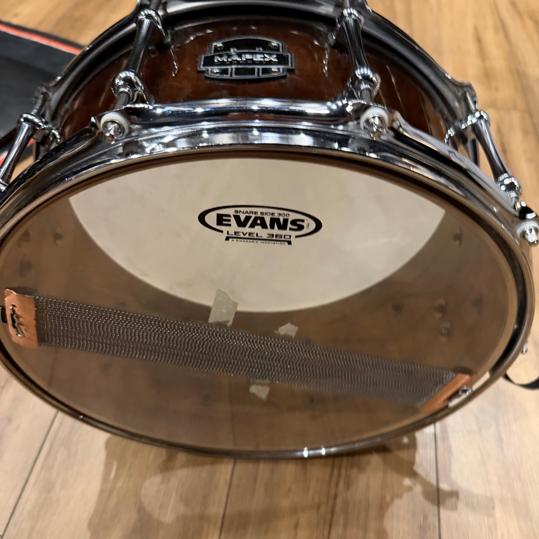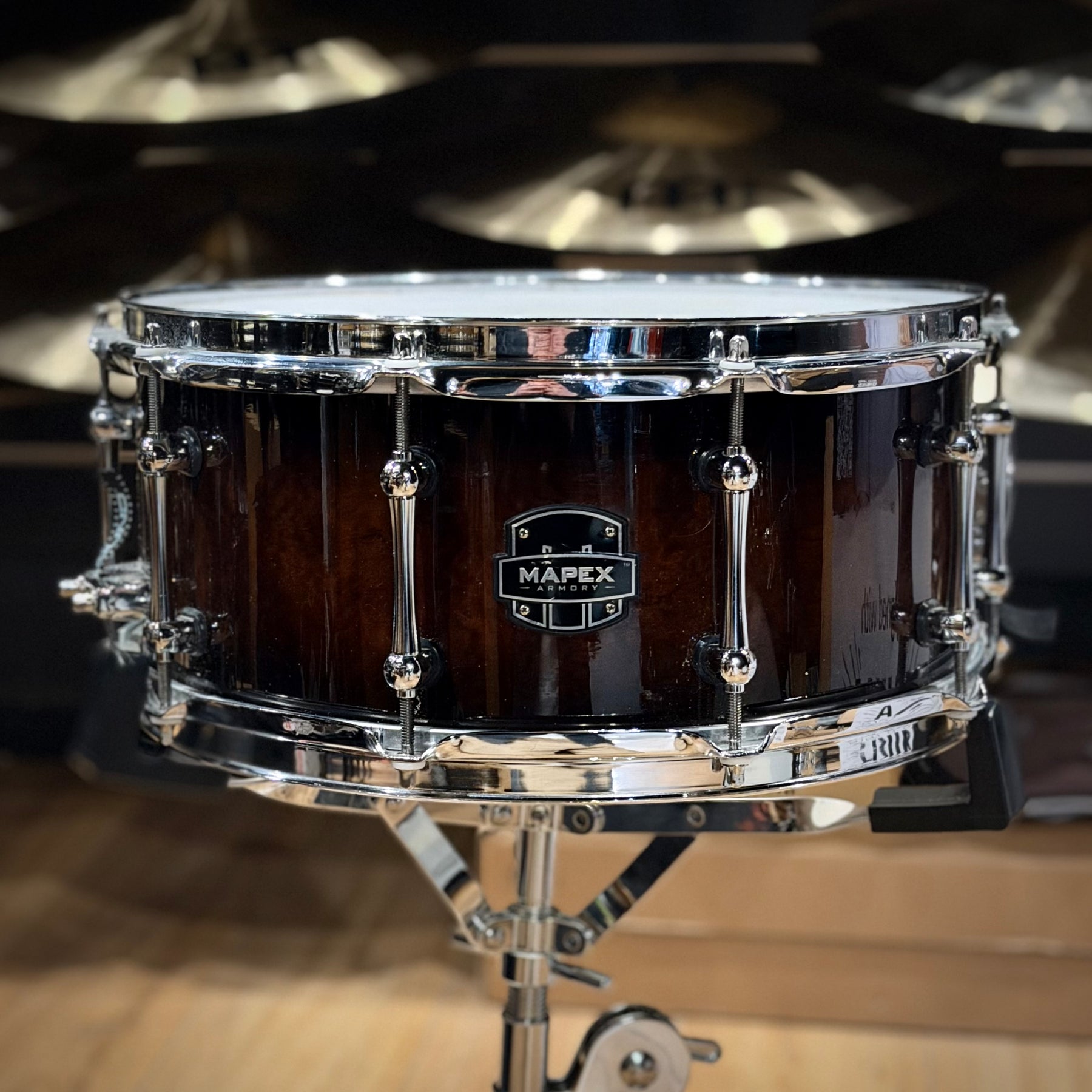 This special snare drum model combines warmth, volume and a throaty attack in a single instrument. The hybrid shell is an offshoot of DW's patented "Edge" design, and consists of a solid brass ring mounted on a 12-ply shell of mahogany and maple. This results in a sound with plenty of bite and ample low end.